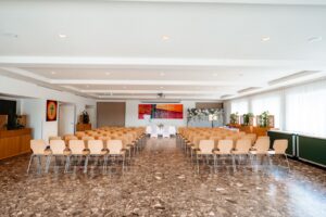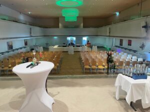 Unser großer Saal (315 m², bis zu 380 Personen) verfügt über eine Galerie und eine breite Bühne – perfekt für große Events, Feiern und Bühnenshows. Für kleinere Anlässe steht unser kleiner Saal (179 m², bis zu 100 Personen) zur Verfügung. Zusätzlich steht ein Seminarraum mit 38 m² zur Verfügung. Dieser ist ausgestattet für Workshops, Schulungen, Besprechungen oder kleinere Seminare. Dank seiner überschaubaren Größe eignet er sich ideal für Gruppen, die in ruhiger Atmosphäre arbeiten möchten.